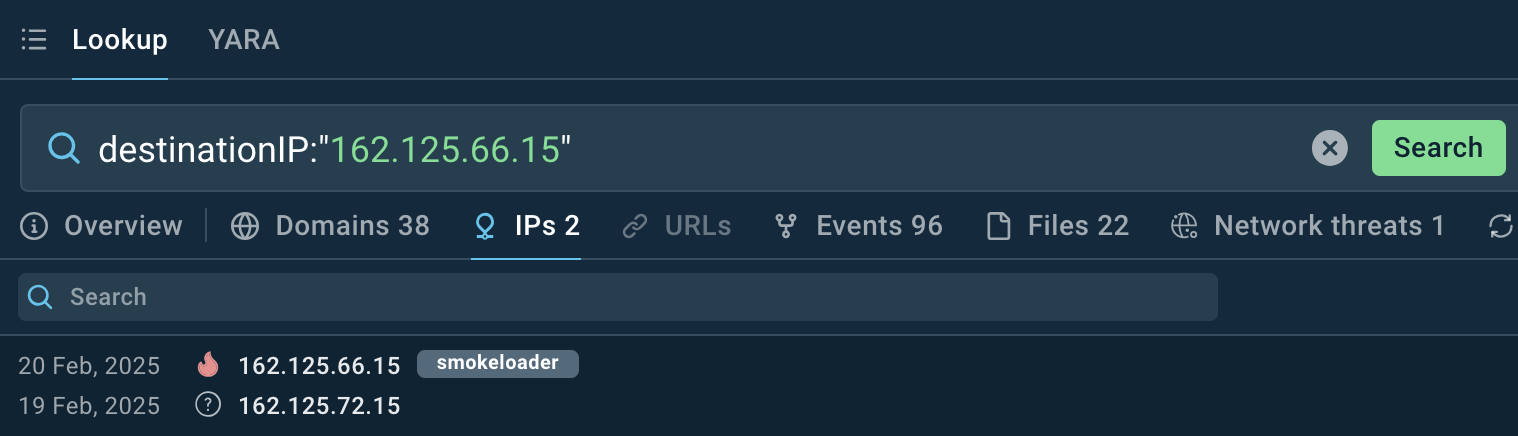 TI Lookup allows fast and precise evaluation of potential IOCs. For example, we can check a suspicious IP that triggered alert and find out that it belongs to a known malware’s infrastructure: